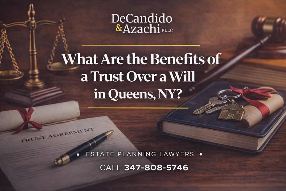An estate plan is not simply about deciding who inherits your property: it’s a legal tool meant to protect what you’ve built, manage risk, and ensure that your wishes are honored once you’re gone. We can help you create a comprehensive strategy that protects your assets here in New York. Schedule a consultation with us today at DeCandido & Azachil, with locations in Forest Hills, NY, and Plano, TX to begin building a plan that fits your life and protects your future legacy.